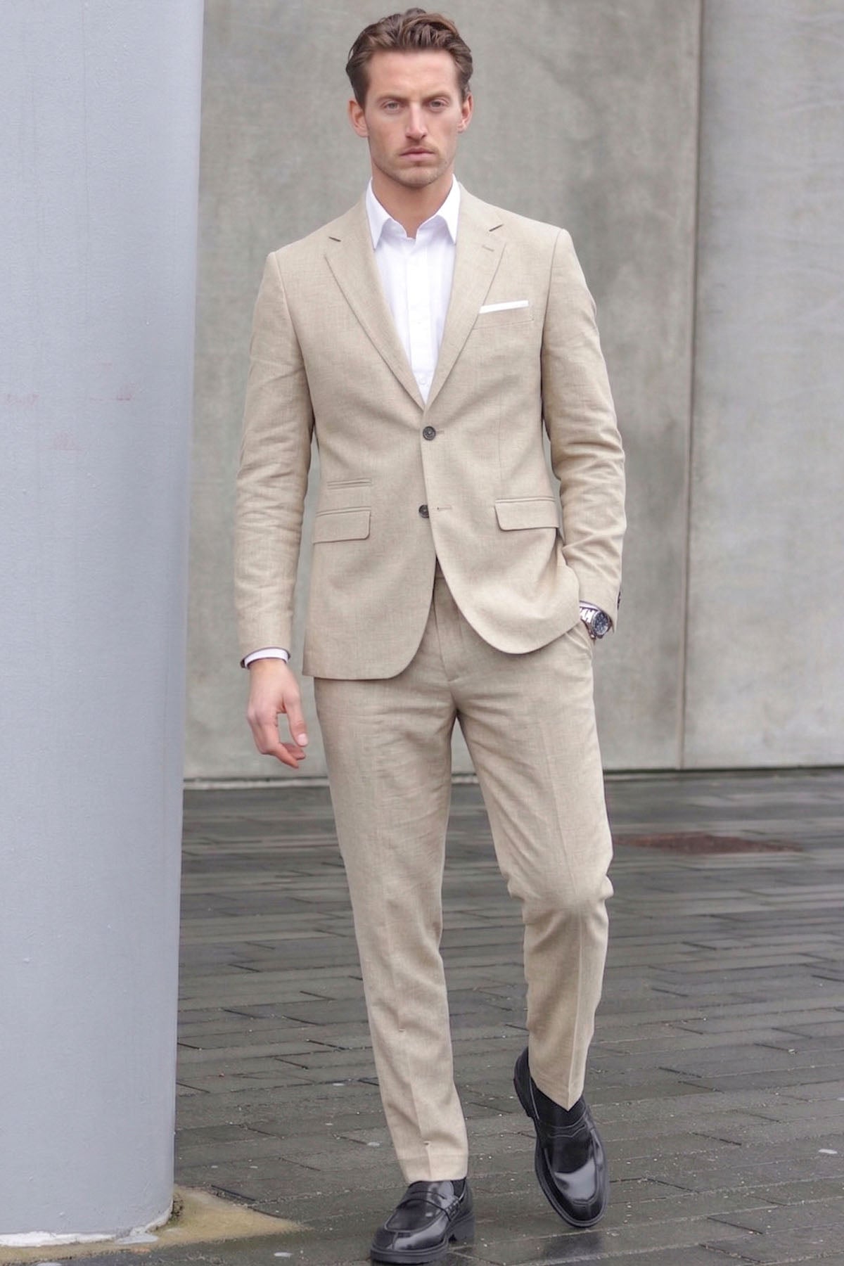 Disse slim fit-buksene i lin kombinerer komfort med et tidløst og formelt uttrykk. Stoffblandingen av polyester, ull og lin gir en behagelig følelse og naturlig tekstur, mens den stramme passformen fremhever en moderne silhuett. Buksene har knapp- og glidelåslukking, praktiske lommer foran og bak, og en nydelig pressfold som gir et skarpt og velstelt utseende.