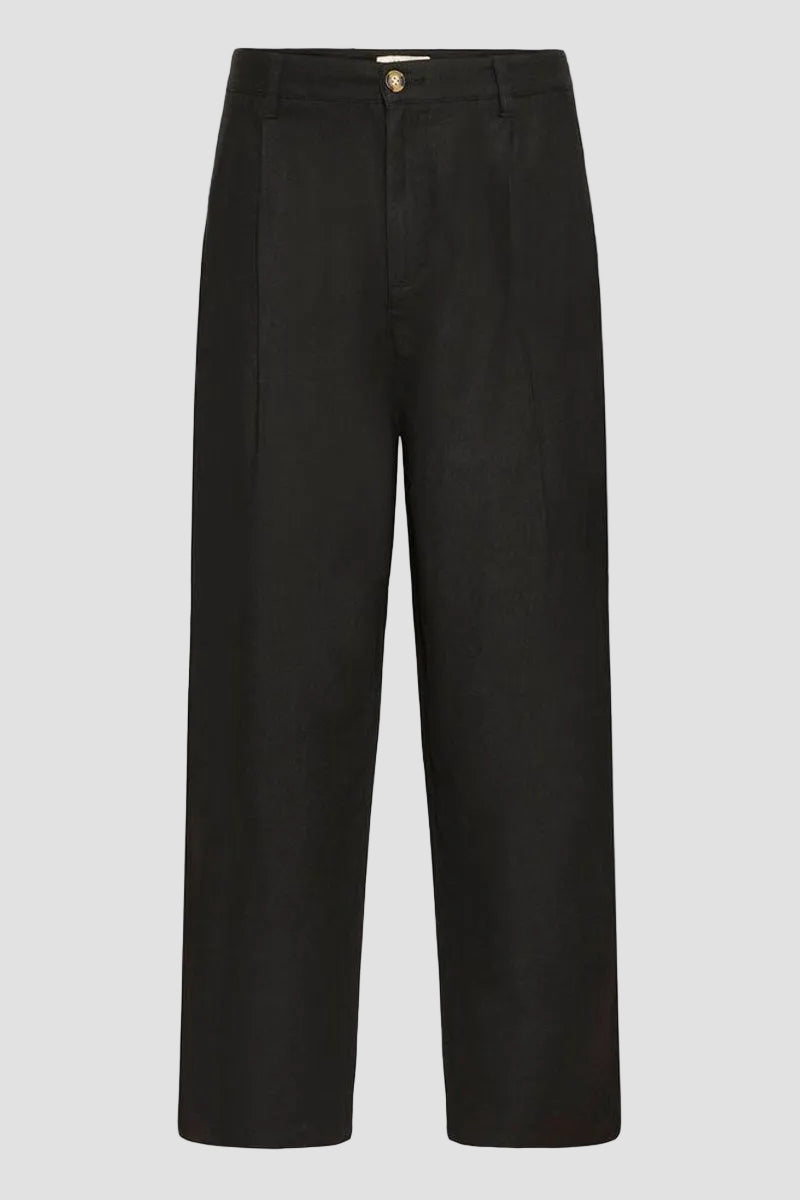 Disse tapered buksene kombinerer en avslappet passform med et tidløst design, perfekt for menn som ønsker både komfort og stil. Laget av en blanding av lin og viskose, gir de et lett og behagelig stoff som føles godt mot huden. Den mørke True Black-fargen gjør buksene enkle å kombinere med ulike plagg til hverdags eller mer formelle anledninger.