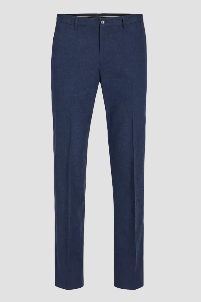 Disse sommerbuksene i en blanding av bomull og lin tilbyr en lett og pustende følelse, perfekt for varmere dager. Den mørk marineblå fargen og den slanke passformen gir et stilig og moderne uttrykk. Midt på livet-passformen sammen med glidelåslukking og beltehemper sikrer både komfort og en klassisk finish.