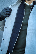 - Grå ulljakke med vertikale sidelommer.