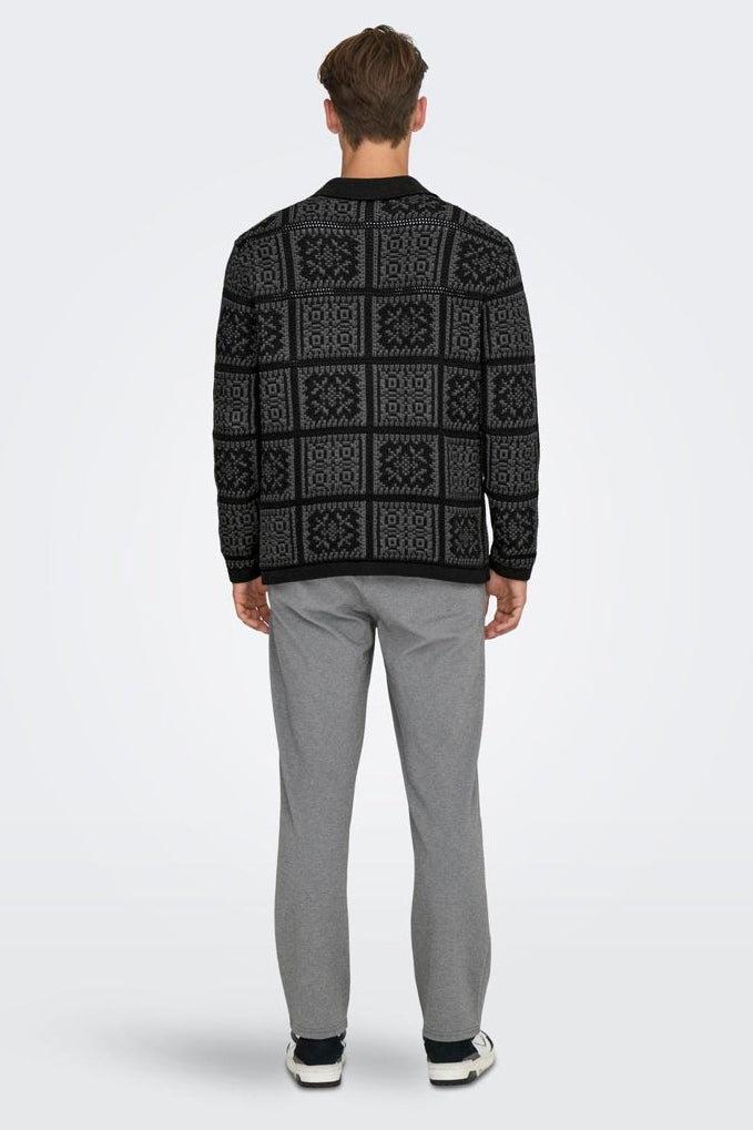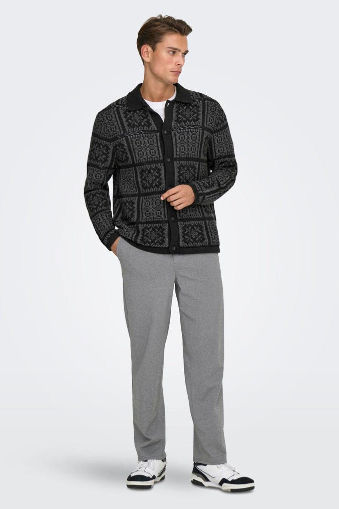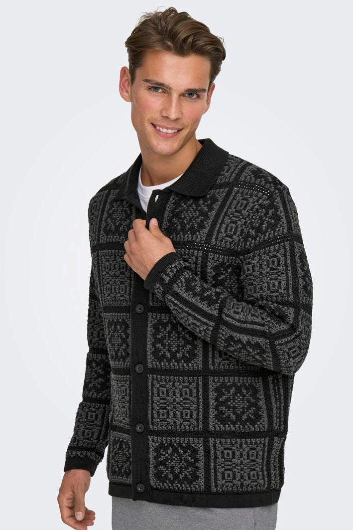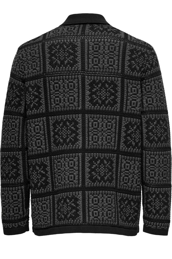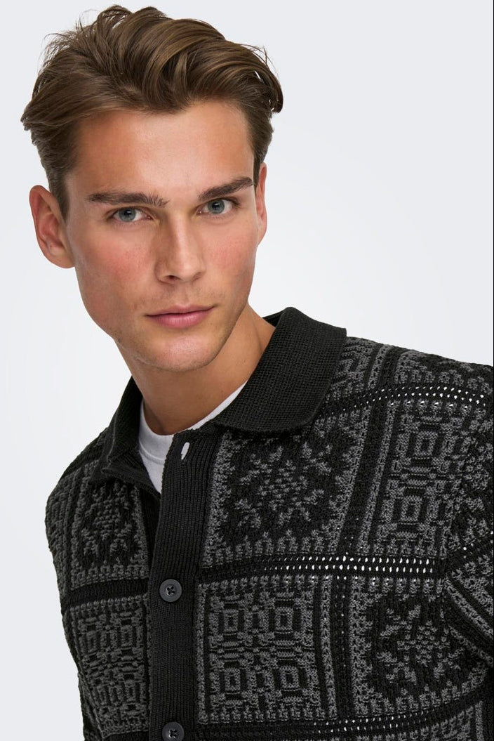 Denne behagelige cardiganen har en avslappet passform og er strikket i en strukturert bomullskvalitet som gir et stilrent og moderne uttrykk. Den sorte fargen med diskrete grå striper tilfører et klassisk preg, og den har en splittet hals samt lange ermer med knappestolpe foran for enkel åpning og lukking. Passer utmerket til uformelle anledninger, samtidig som den kan kombinere ned formelt og festligere antrekk.