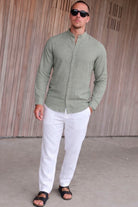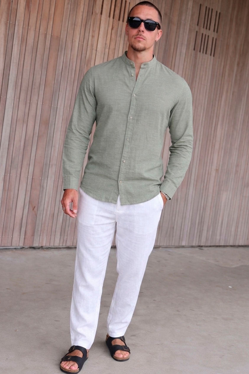 Summer Linen Blend Band Shirt L/S New Sage