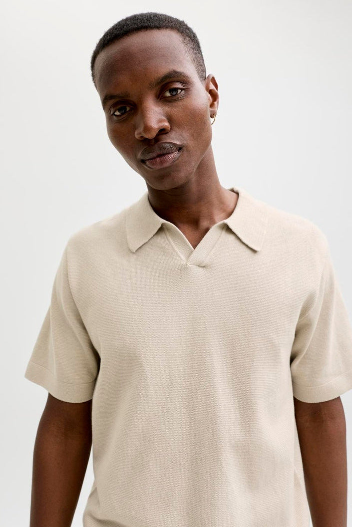 Dette strikkede poloshirtet har en klassisk splittet hals og korte ermer med innsatte ermer som gir en behagelig passform. Den har en regular fit som passer godt for en tradisjonell livsstil. Stoffet er laget av en blanding av økologisk bomull og resirkulert polyester, noe som gir både komfort og et bærekraftig valg.