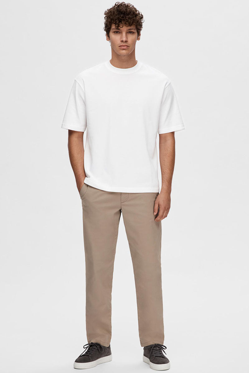 Denne løstsittende t-skjorten med rund hals og korte ermer er et tidløst plagg som passer perfekt i garderoben til enhver mann. Kombinasjonen av økologisk bomull, resirkulert polyester og elastomultiester gjør den både myk og behagelig å ha på, samtidig som den har god stretch og holdbarhet. Den lyse, nesten hvite fargen gir et rent og friskt uttrykk som enkelt kan styles med andre plagg.