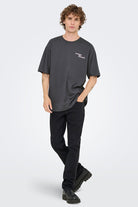 - T‑skjorten har rund hals og en relaxed passform