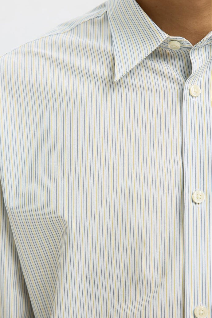 Denne stripete skjorten har en boxy passform og er laget med en blanding av økologisk bomull og vanlig bomull, noe som gir en myk og behagelig følelse. Den lange ermene med knappede mansjetter og klassisk skjortekrage gir en tidløs stil som passer godt til både kontoret og mer formelle anledninger. Den lette poplin-kvaliteten med lett strykefinish gjør skjorten enkel å vedlikeholde, samtidig som skjult knappelukking sikrer et sofistikert uttrykk. Den kurvede kanten på plagget tilfører en fin detalj som gir skjorten et moderne preg.