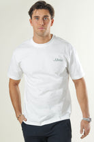 Denne t-skjorten er laget i 100 % økologisk bomull som gir et mykt og pustende stoff, perfekt for en avslappet og behagelig følelse hele dagen. Den har rund hals og korte ermer med en avslappet passform som gjør den enkel å kombinere med både formelle og mer uformelle antrekk. Trykket på både foran og bak tilfører et stilfullt og moderne uttrykk, med en gummiert finish som gir en myk følelse mot huden.