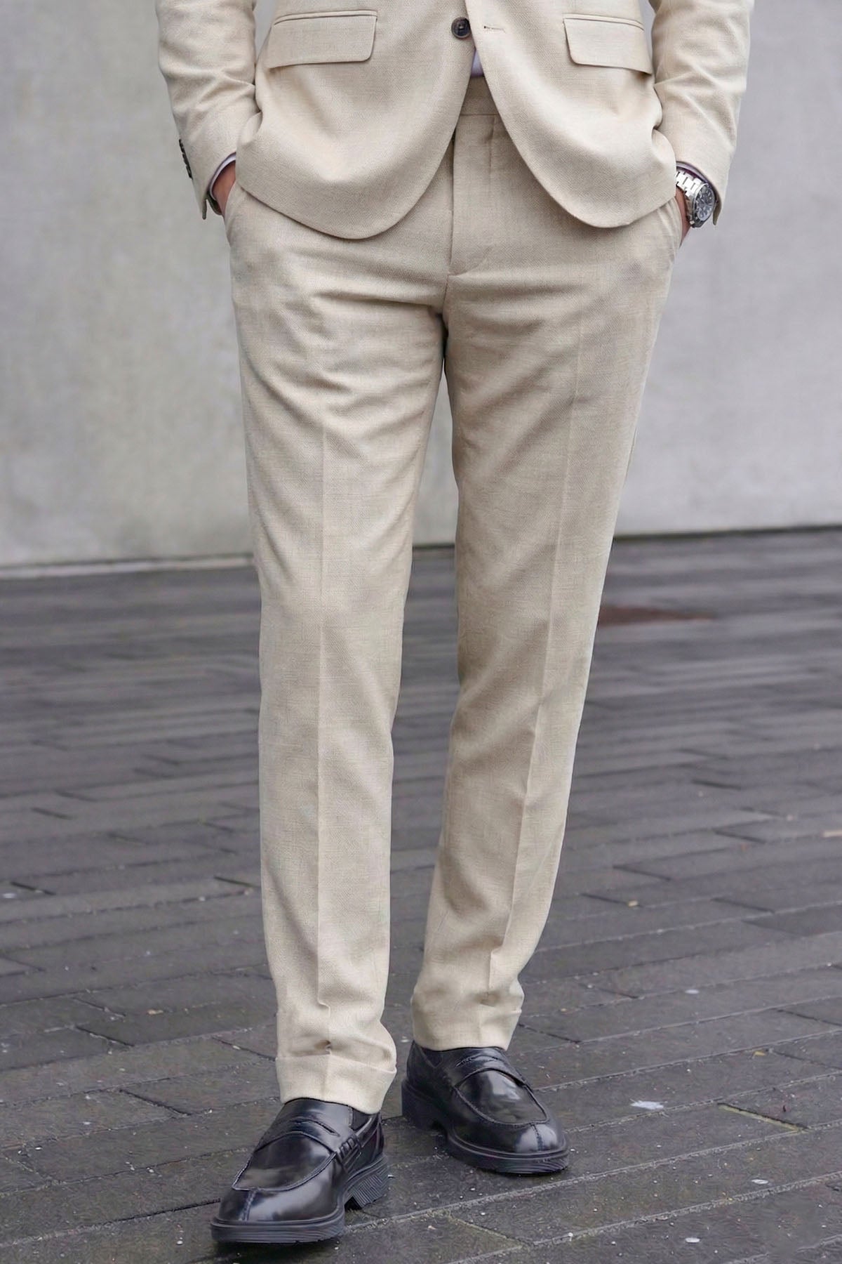 Disse slim fit-buksene i lin kombinerer komfort med et tidløst og formelt uttrykk. Stoffblandingen av polyester, ull og lin gir en behagelig følelse og naturlig tekstur, mens den stramme passformen fremhever en moderne silhuett. Buksene har knapp- og glidelåslukking, praktiske lommer foran og bak, og en nydelig pressfold som gir et skarpt og velstelt utseende.